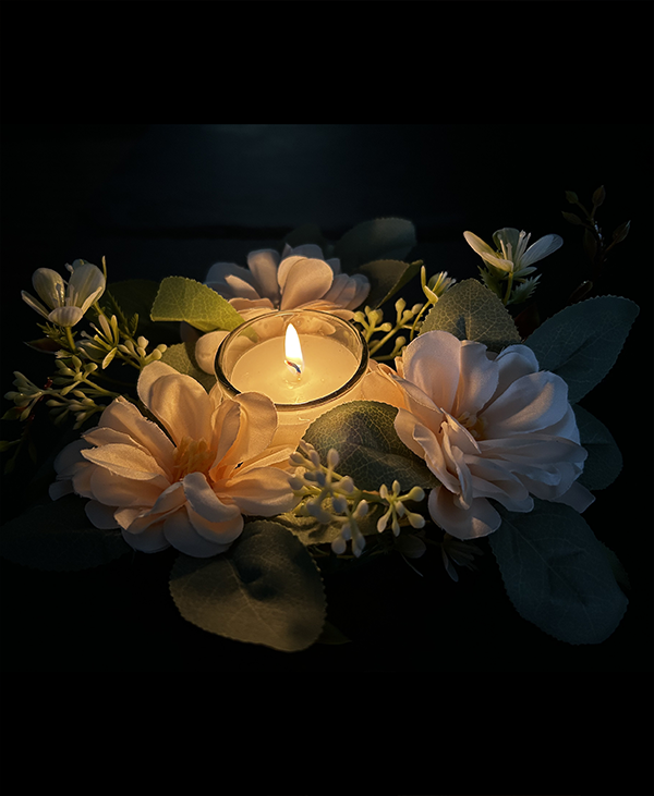 Au choix : bougie seule ou bougie avec couronne de fleurs artificielles.